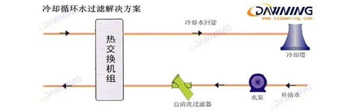 我們?yōu)槠涮峁┑倪^濾解決方案解決這一問題,如上面流程圖所示,我們在水泵和換熱器之間設(shè)備一臺自清洗過濾器(電動(dòng)刷式過濾器或電動(dòng)式自動(dòng)排污過濾器),根據(jù)現(xiàn)場實(shí)際情況,選擇相應(yīng)的過濾網(wǎng)和過濾精度,這些將保證在不影響水系統(tǒng)正常運(yùn)行的狀況下,自清洗過濾器會過濾掉符合精度的所有雜質(zhì),并在設(shè)定的壓差或時(shí)間范圍內(nèi)自動(dòng)清洗濾網(wǎng)、自動(dòng)排污。自清洗過濾器的設(shè)置,將大大提高系統(tǒng)的換熱效率、減少系統(tǒng)補(bǔ)水量、提高水的濃縮比,達(dá)到節(jié)水、節(jié)能、環(huán)保的目的。