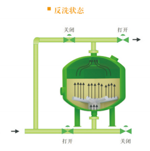 隨時雜質(zhì)在濾料層中不斷聚積,壓力損失不斷增加,當壓差增加到某一設(shè)定值時或到達設(shè)定的清洗時,系統(tǒng)將自動轉(zhuǎn)換至反洗狀態(tài)。加壓水通過集水裝置進入濾料層,對其進行沖刷,使截留的污染物脫落并排出過濾系統(tǒng)。反洗持續(xù)至少2分鐘后,閥門自動將系統(tǒng)轉(zhuǎn)至過濾狀態(tài)。
